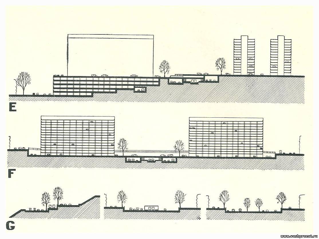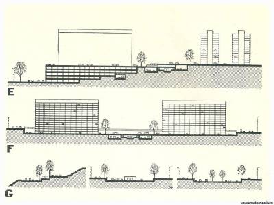 Архитекторы: Г. П. Д. ВАН ГИНКЕЛЬ (Н. P. D. VAN GINKEL), Б. Л. ВАН ГИНКЕЛЬ (В. L. VAN GINKEL) и соавтор Ж. Л. ЛАЛОНД (J. L. LALONDE)Проект реконструкции транспортной сети центра города разработан по общественному заказу для Гражданского комитета и был принят как основной проект генерального плана.Большая часть предложенных проектом реконструкции мероприятий с небольшими изменениями приводится в жизнь. Предстоящая в 1967 г. Всемирная выставка заставила немедленно приступить к работам по реконструкции подъездов, упорядочению автомобильных дорог, которые уже строятся так же, как метрополитен. При разработке проекта реконструкции транспортной сети, не было никаких указаний или норм по планировке города и района или плана использования территорий, по которым должны были быть проложены сети дорог. Было необходимо прежде всего установить «Основные нормы и правила» для проектирования транспортной сети. Эти «Правила» не должны были рассматриваться, как нечто заменяющее основной проект реконструкции и составлены в общих чертах. Значительной частью проекта реконструкции явилась разработка судостроительной системы использования территории, которую должна обслуживать транспортная сеть, конкретно был разработан предварительный проект реконструкции центра Ошелага (Hochelaga). Центр Монреаля расположен между портом на реке Св. Лаврентия и горой Монреаль. Эта территория разбивается проектом на три естественные террасы, около каждой из них стихийно возникли деловые центры. Основные магистрали проложены вдоль террас с востока на запад, на довольно узком пространстве. Почти весь центр построен по сетке: восьмигранными ячейками, только старый город имеет менее правильную планировку. Основные магистрали тянуться непрерывно с востока на запад, улицы же, проложенные с севера к югу, имеют неодинаковую ширину. В противоположность другим городам Северной Америки Монреаль имеет довольно компактный центр, пригодный для автомобильного движения. Плотность застройки центра увеличилась в результате реконструкции и в связи со строительством небоскребов. Хотя это значительно ухудшило условия в центре, но не мешает созданию простой и экономичной транспортной системы. Проект реконструкции сети рассчитан на вывод транзитного движения за пределы городского центра. Транспортная сеть состоит из двух автомобильных магистралей, проложенных с востока на запад через существующие мосты на реке Св. Лаврентия: первая проходит по существующему бульвару «Метрополитен», вторая - по скоростным магистралям Папино и Декари, пересекающим районы, подлежащие реконструкции; двух автомобильных дорог, ориентированных с севера к югу, линий общественного транспорта и метро, размещенных между автомобильными дорогами, продолжающихся по предместьям и выходящих к железной дороге. Новый центр состоит преимущественно из двух площадей (Ошелага и Виль-Мари), между которыми строится крупный деловой комплекс с гостиницей, центральным вокзалом и аэровокзалом, размещенным на платформе, перекрывающей линии метро, железнодорожные пути и автовокзал. Проект реконструкции города даст лучшее использование территории, размещение зданий оживят существующий центр, позволят использовать «мертвые зоны», объединят город цепью площадей и парков, отчего выиграет остров и набережные реки, где проектир